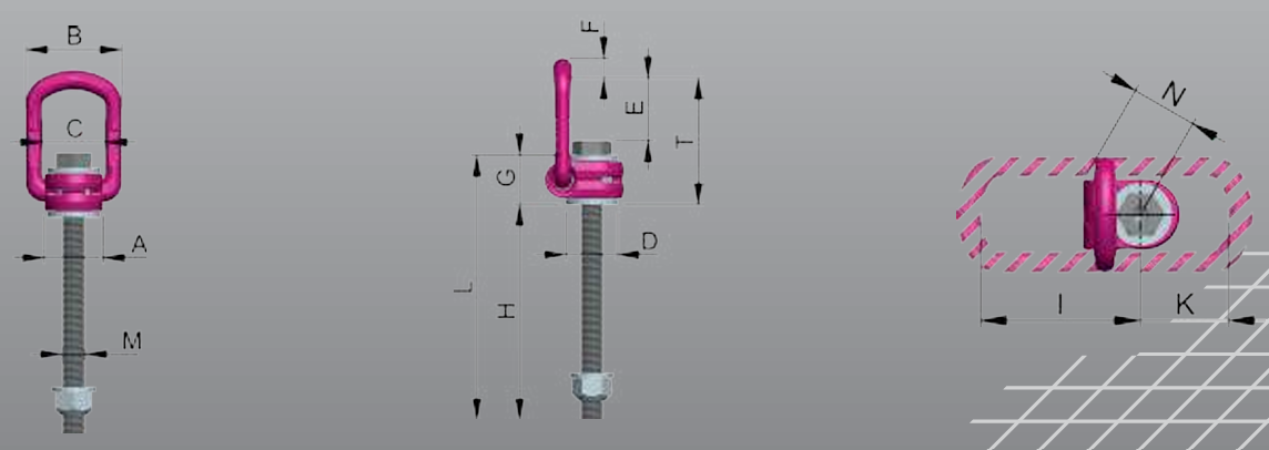 | Type | WLL (t) | Weight (kg/pc) | T (mm) | A (mm) | B (mm) | C (mm) | D (mm) | E (mm) | F (mm) | G (mm) | H (mm) | I (mm) | K (mm) | L (mm) | M (mm) | N (mm) | Torque (Nm) | Ref No. |