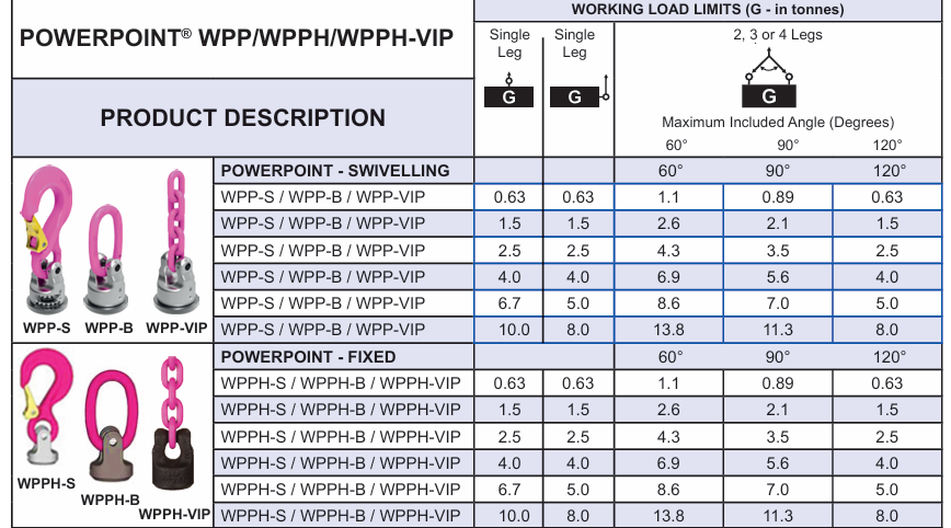 | Type | WLL (t) | A | B | C | D | G | T | weight (kg) | Welding size HV + filled weld | Ref-no. WPP | Ref-no. WPPH |